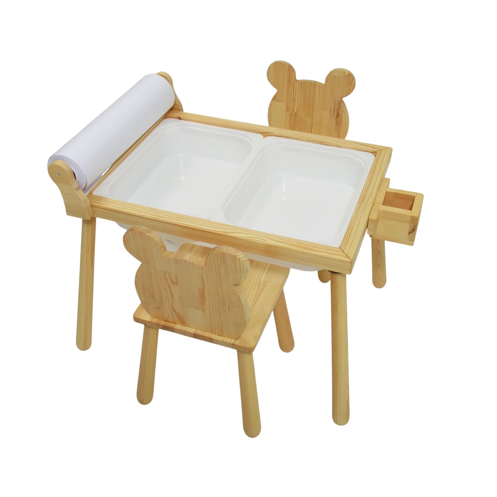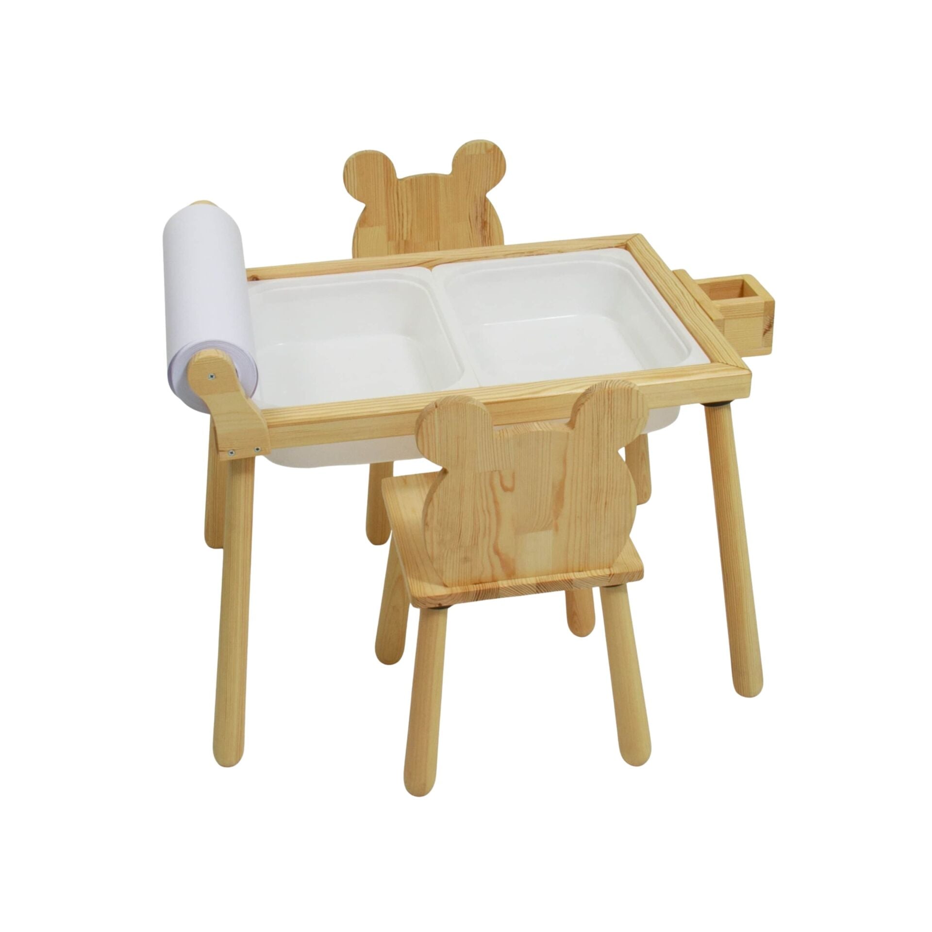 Rulo Aparatlı Doğal Ahşap Duyusal Çocuk Aktivite Masası Oyun Masası 2 Adet Ayı Sandalye